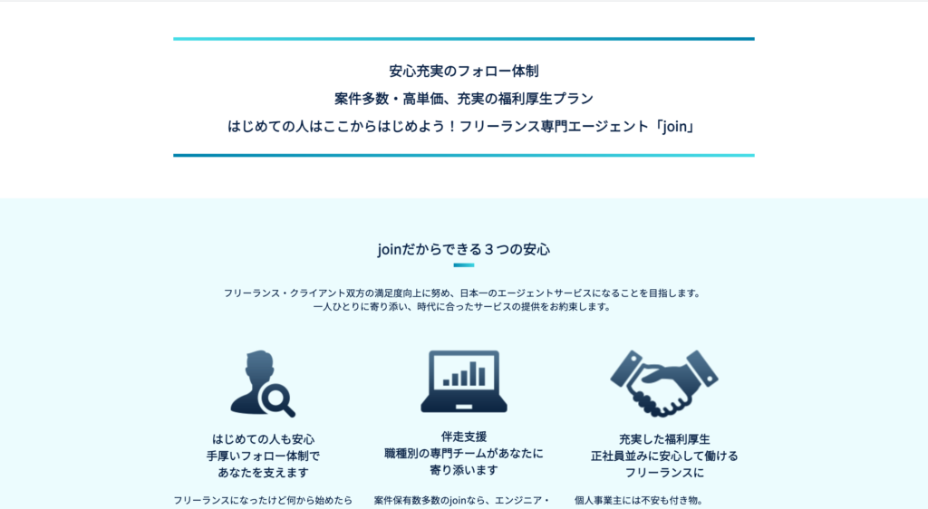 joinはエージェントの中でも「初めてフリーランスになる方向け」のサービスが充実しているのが特徴です。