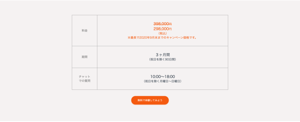 2020年9月30日まで受講料10万円OFFのキャンペーンを実施しています。転職がセットになると60万円以上するプログラミングスクールが多い中、337,800円で受講できるのは破格と言えます。